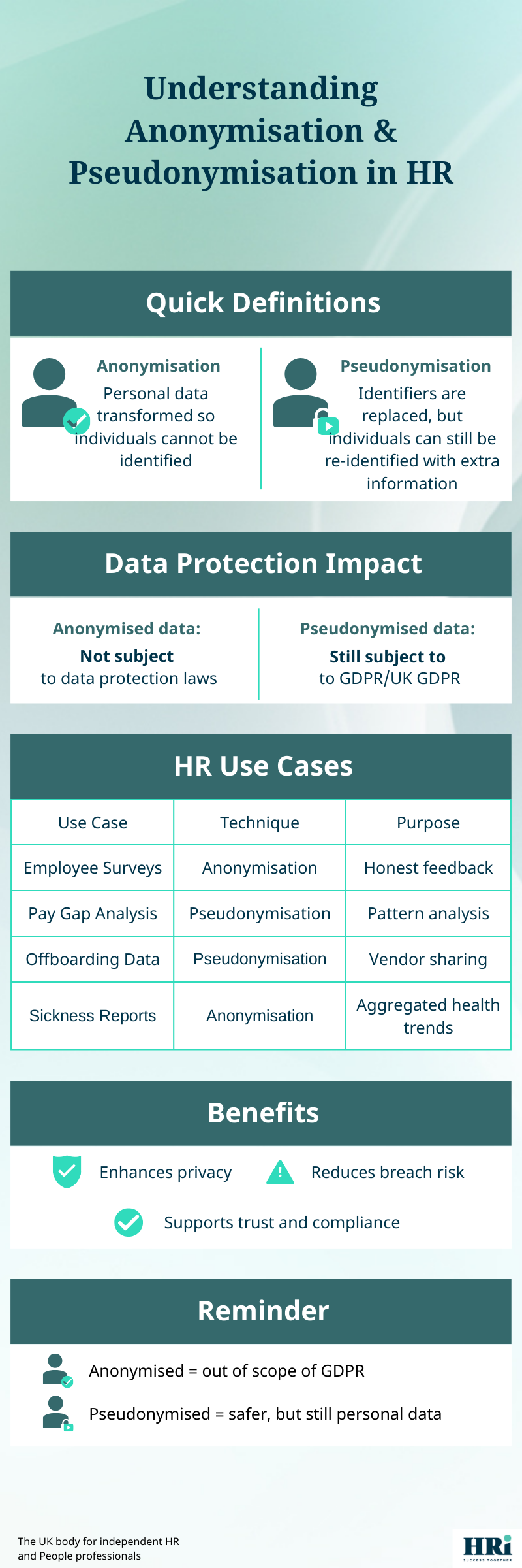 To help you get to grips with the key takeaways, we’ve created a clear, easy-to-follow visual guide. It breaks down the core differences between anonymisation and pseudonymisation and offers simple examples you’ll recognise from everyday HR work.